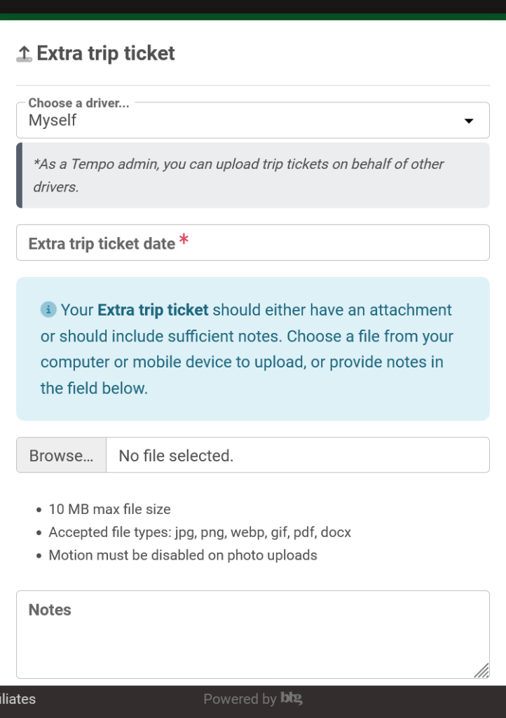 A pop-up window will appear and allow an extra trip ticket to be uploaded for myself or another driver. Fill out the required fields: