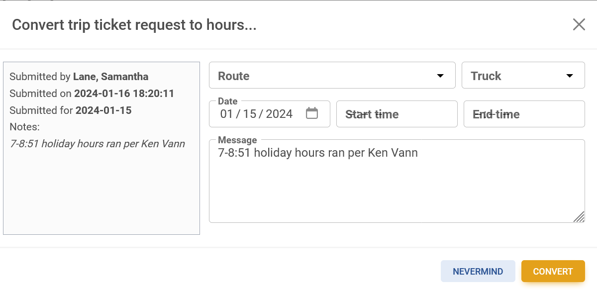 To convert trip tickets to the driver’s timesheet simply click or select to convert submitted extra trip tickets to timesheets hours, once selected popup window will appear. Fill out the form and select or click the yellow convert button to convert the extra trip ticket.